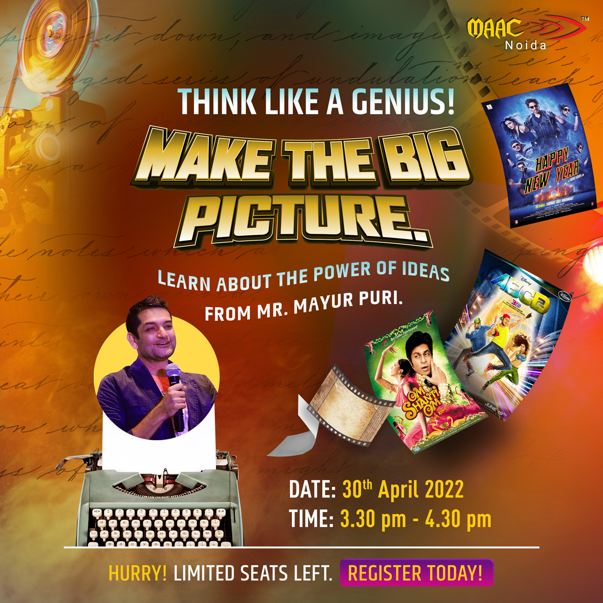 As part of the “Make the Big Picture” webinar series, MAAC has organised an exciting webinar with Mr Mayur Puri, renowned filmmaker, lyricist, actor, and screenwriter for blockbuster movies like Om Shanti Om and ABCD. Attend the webinar and get expert career advice from Mr Puri on how to master the art of storytelling and learn about the power of ideas..! #learnmotiongraphics #careersinanimation #interiordesigninstitute #autocadcourse #autocadcourseinnoida #motiongraphice #MAAC #animation #webdesigncourse #gamedesigncourses #videoeditingcourse #solidworkscourse #maacanimationnoidasector62 #GraphicDesignCourse #AnimationCourse #WebdesignCourse #CareerCourse #FilmmakingCourse #GraphicDesignCourse #WebDesignCourse #VFXCourse #Animationcourse #GraphicDesignCourse Give us miss call: 08042781252