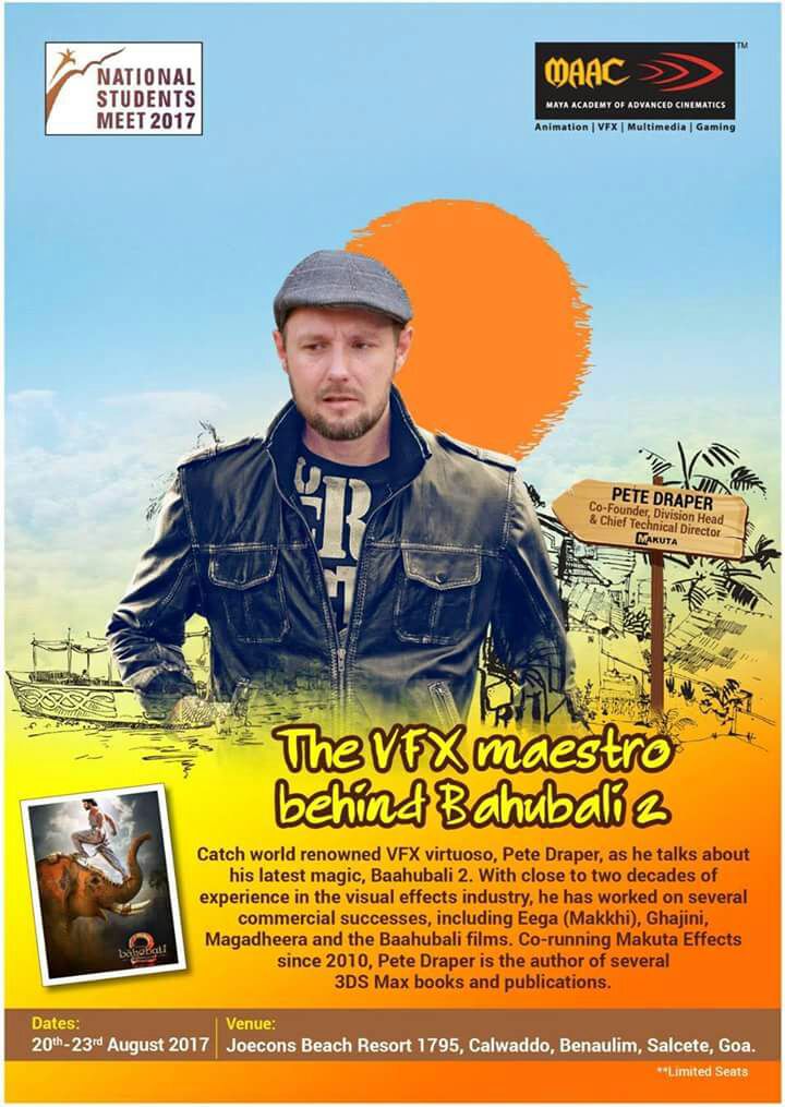 Catch world renowned VFX virtuoso, PETE DRAPER, at National Students Meet-2017, Goa. He is the co- founder, Division Head & Chief Technical director at Makuta. The VFX Makuta. The VFX Maestro behind Bahubali. Register Now. Call - 8383821380 / 0120-4237700.